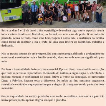 Por isso, a tranquilidade do trajeto era essencial. E posso dizer, com absoluta convicção, que tudo superou as expectativas. O conforto do ônibus, a organização e, sobretudo, a postura humana e profissional de quem esteve à frente da condução, os motoristas Diego e Fabrício, fizeram toda a diferença. Do início ao fim, sentimos segurança, serenidade e cuidado, o que permitiu que a viagem já começasse sendo parte das boas memórias.